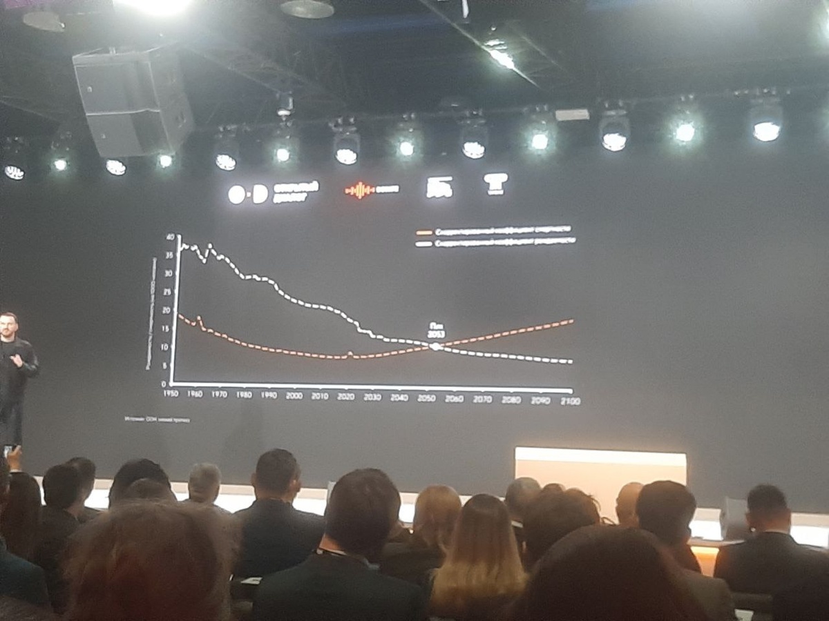 Вот ещё один интересный график, белая линия говорит о тенденции падения уровня рождаемости и коричневая линия о повышении уровня людей