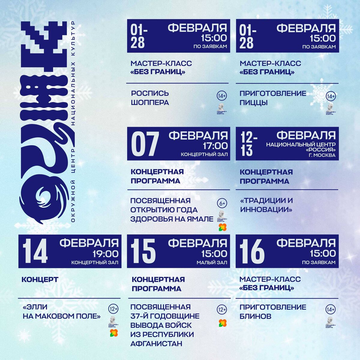 🗓 Собрали для вас самые интересные события предстоящего месяца, чтобы вы могли провести его тепло, активно и культурно. Выбирайте, сохраняйте в закладки и встречайте февраль без скуки! Приобрести билеты и забронировать места можно по ссылкам ниже👇 ⭐️ концертная программа, посвященная открытию Года здоровья на Ямале: clck.ru/3RZQwR ⭐️ концерт «Элли на маковом поле»: clck.ru/3RZQzU ⭐️ мастер-класс «Чек лист вокалиста» от Ирины Бархатовой: clck.ru/3RJSto ⭐️ мастер-класс «Поэзия как путь к себе» от Анны Сеничевой: clck.ru/3RJTBn ⭐️ концерт «Время музыки. Время поэзии»: clck.ru/3RZR5b ⭐️ гала-концерт в рамках проведения музыкального патриотического конкурса «Дорогами поколений»: clck.ru/3RZRCg ⭐️ концертная программа этно-группы «Хун Хурту»: clck.ru/3RZiYU ⭐️ юбилейный концерт Ансамбля селькупской песни «Мачит Коймы»: clck.ru/3RZhQN ⭐️ комплекс мастер-классов «Без границ» запись по телефону: +7 (992) 407-05-02 📎 билеты можно приобрести по Пушкинской карте или через сервис «Морошка» с