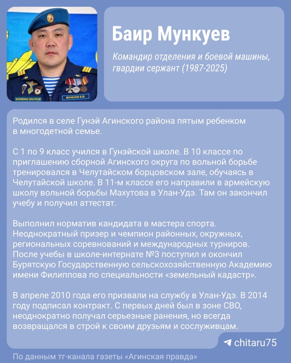 За проявленные мужество, отвагу и храбрость Баира Шухуртуевича наградили медалью «За отвагу» и орденом Мужества. У него остались супруга и трое детей. В тг-канале газеты «Агинская правда» пишут, что Баир Мункуев с детства рос активным, решительным и жизнерадостным: У него была внутренняя сила, которая притягивала людей. Сила — это его безграничная доброта, его честность, непоколебимая вера в справедливость. Умел заряжать своим позитивом окружающих. Стойкость духа, храбрость делали его настоящим лидером. Он всегда ценил своих друзей, сослуживцев и время, проведенное в кругу семьи. 🟦 «Чита.Ру» в MAX | Предложить новость