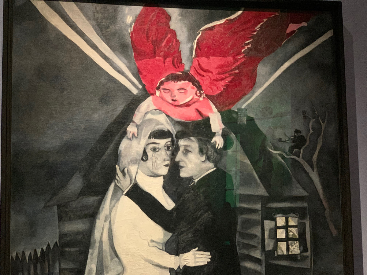 - Выставка очень, очень небольшая. Оно и понятно: представлены работы из Третьяковки, Русского музея, графика из коллекции, подаренной дочерью художника Пушкинскому музею в девяностые годы и несколько работ из провинциальных музеев. Ни из Ниццы, ни из других музеев, ясно, ничего не привезли. Из знаковых работ (имхо) – присутствует «Красный Еврей» (Зеленого и синего нет), венчание с Бэлой и красным ангелом, «Прогулка» и «Над городом».