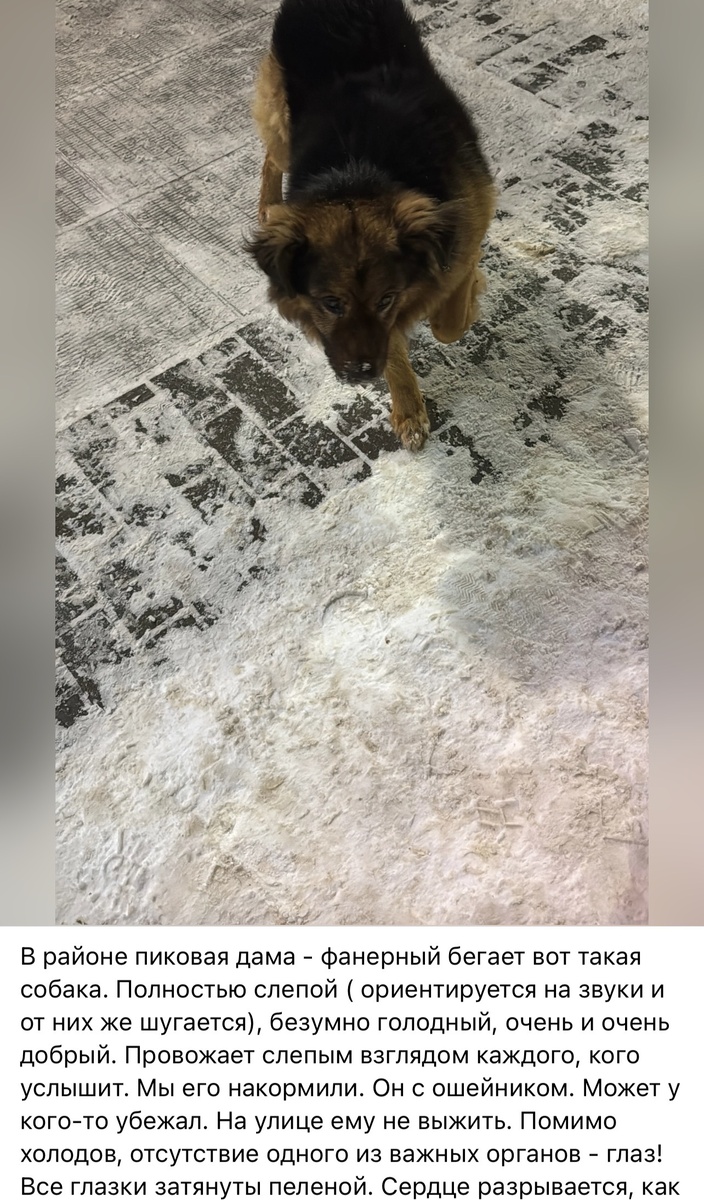 30 января стали поступать сообщения о слепой собаке в районе Южного: пёс совершенно не ориентируется в пространстве, натыкается на сугробы, с трудом передвигается. В нынешних погодных условиях улица для него - смертельный приговор. Пес в ошейнике, но его никто не ищет(