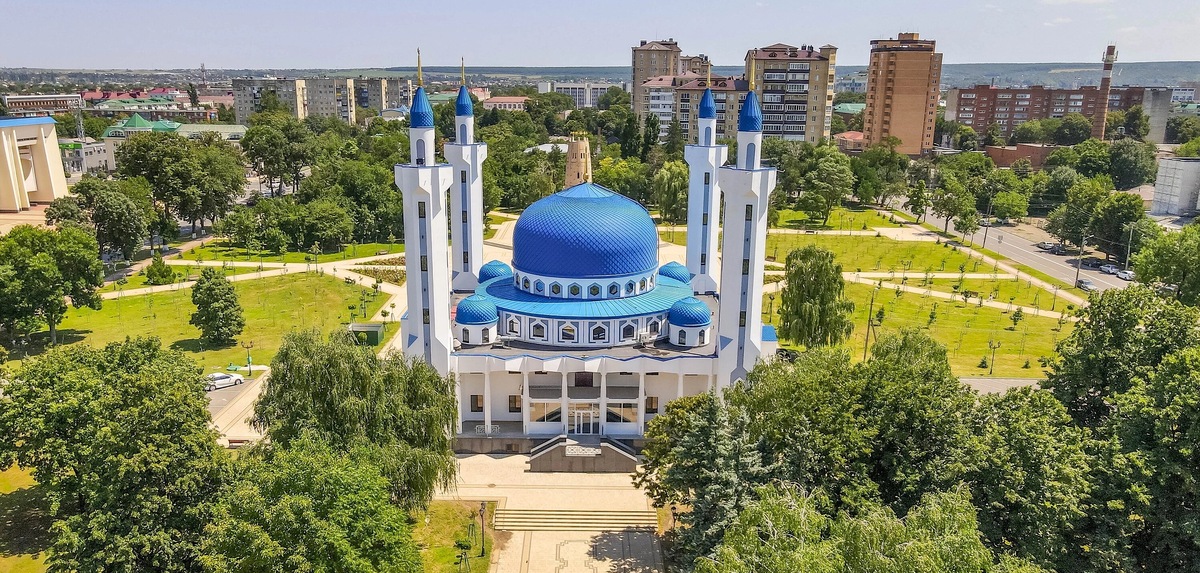 Начать знакомство с Майкопом можно с главной святыни города — Соборной мечети, расположенной на площади Дружбы. Храм построен из белого камня, его украшают четыре высоких минарета и ярко-синие купола.