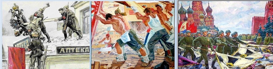 До революции оставалось всего 17 лет. Не могла она не случиться! Картинку вначале я взял в интернете, где ещё есть подлинные факты. На первой картине момент, когда рабочие сбивают символ самодержавия и эксплуатации трудового люда – ненавистного чёрного мутанта. Что было после этого, знает весь мир. То, что в центре, - о 30х годах, когда вся страна пела «Мы рождены, чтоб сказу сделать былью». На первом плане рабочий в лаптях, который своей мечтой и трудом сделает Россию-СССР Великой Державой, победившей фашизм, первой в мире вышедшей в Космос. Верней, весь мир знал это и даже менялся под воздействием чудес, которые творил свободный от эксплуатации народ. Но с возвращением в 1991 году символов царизма и белогвардейщины словно какая-то гидра выжирает память. В первую очередь - в самой РФ!