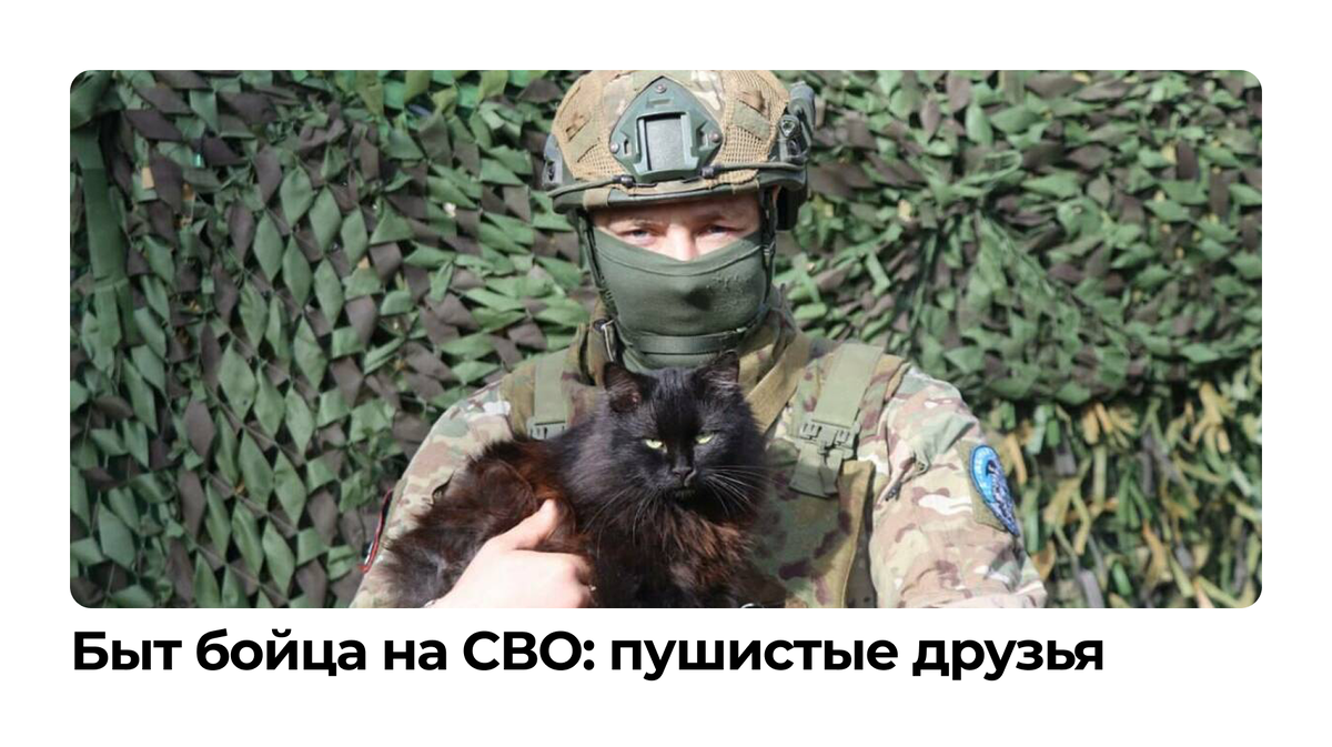 В реальных полевых условиях к людям почти всегда тянутся животные. Бездомные собаки и кошки, бродящие по окраинам населённых пунктов или по позициям, постепенно оседают рядом с бойцами, а потом и в блиндаже. Формально это «лишние рты» и источник хлопот. Фактически — важный элемент быта и психологической устойчивости. Историю рыжего кота на СВО можно посмотреть здесь. Кот прибился к бойцам и стал частью команды: он ловит грызунов и перемещается по позициям вместе с бойцами. Как животные оказываются на позициях
