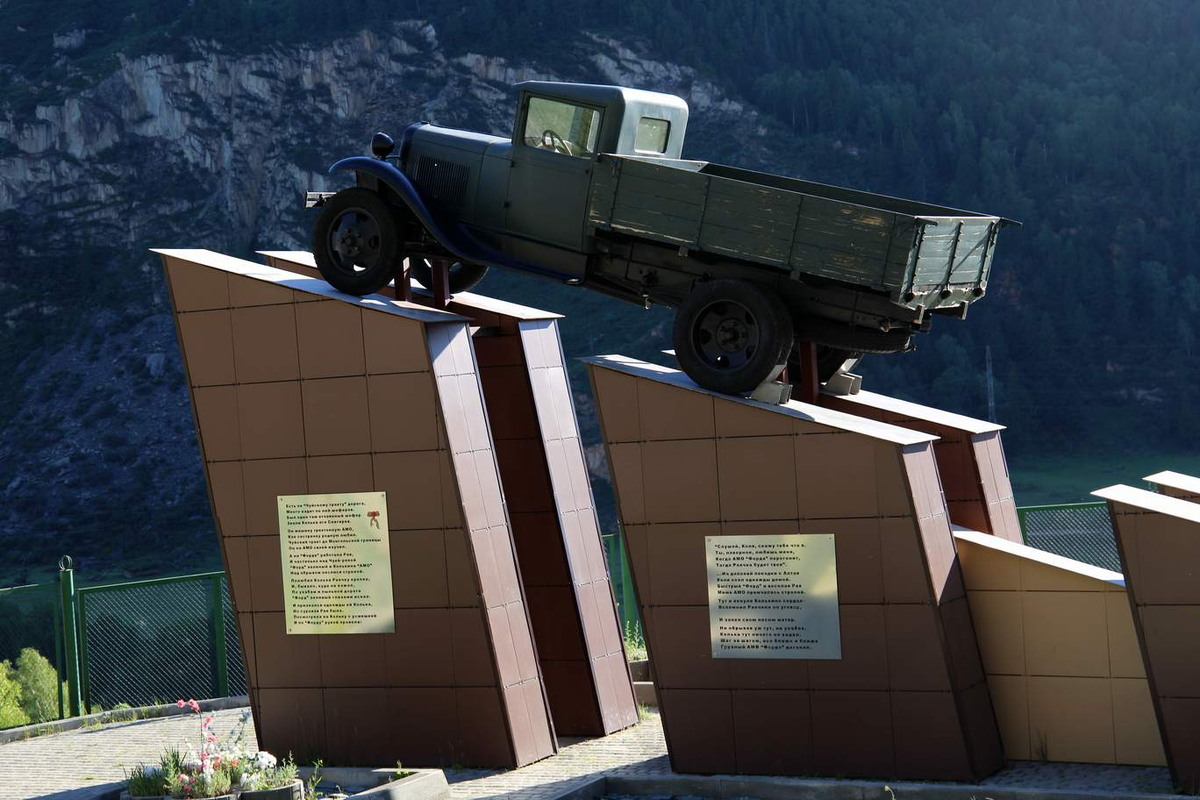 - Монумент строился как дань уважения всем водителям, которые в годы освоения Чуйского тракта преодолевали крутые перевалы, узкие серпантины и опасные участки дороги в суровых условиях.