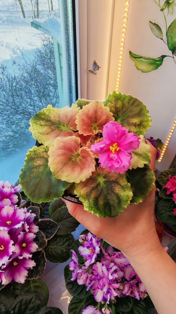 ! Сегодня работали над укоренением пасынков этой удивительной фиалочки и решили показать вам этот красивейший гибрид! Шикарная кроновая розовая пестролистность, некрупная аккуратная розеточка и удивительно подходящие розовые махровые цветочки. Наша малышка только запускается, по факту цветы крупные и очень махровые: 5-7см! 🙏❤🥰