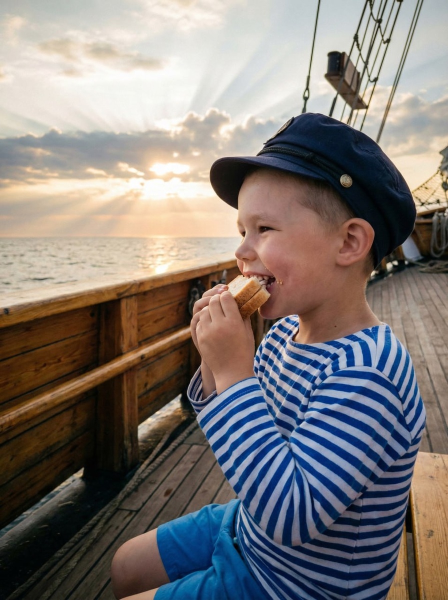 🔠🔠🔠🔠🔠🔠🔠⭐️ Промт из серии "Капитан" 5 из 8 Промт адоптирован для мальчика 5 лет, меняем цифру на нужную и меняем BOY на GIRL 👉Генерирую тут Use the uploaded photo to reference your face and appearance. Keeping the facial features and not changing. Keep 100% similarity. Golden Ratio composition. Candid profile shot. The 5-year-old boy, wearing a telnyashka, blue shorts, and captain's cap, is smiling happily while taking a bite of a sandwich on deck. Dramatic golden sunset over the Barents Sea, with distinct sun rays piercing the horizon. Joyful, warm atmosphere. Shot on a Leica M5 --ar 3:4 Заказать промт или фотосессию. ✉️ Буст канала. ⚡️ #нейросеть #aiфотосессия #промтыдляфотографа #детскийпромт