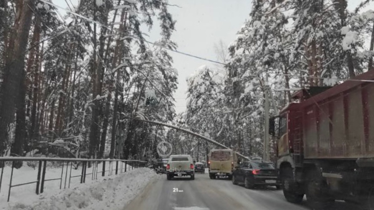 На Николиной горе сосна упала и повисла над дорогой