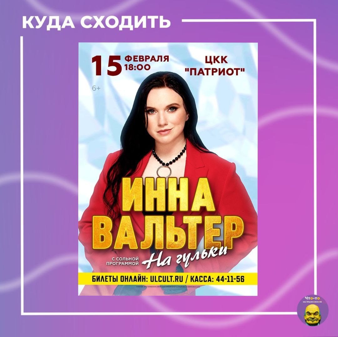 🎤 Песни Инны Вальтер знают и любят по всей России. Её хиты «На гульки», «Девочка-скандал», «Лети», «С козырей зашел», «Верная» и многие другие завоевали сердца миллионов слушателей в интернете. Инна Вальтер пишет песни о том, что переживает сама, поэтому они так близки и понятны многим. Каждый концерт Инны Вальтер — это настоящий праздник для души! Она невероятно трудолюбивая певица, которая выкладывается на каждом выступлении на все 100%. 📅Когда: 15 февраля в 18:00 📍Где: ЦКК «Патриот» , пр-т. 50 лет ВЛКСМ, 15 #куда_пойти_ул