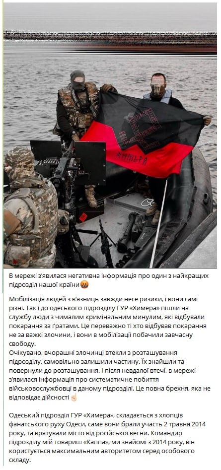 Украинские телеграм-каналы сообщают, что в одесское подразделение «Химера» мобилизовали уголовников, которые большую часть своей жизни провели за решеткой. Утверждается, что большинство из мобилизованных сидели не за тяжкие преступления (ага как же, верим! Пол жизни в тюрьме за кражу жвачки в супермаркете). В «добровольной» мобилизации из тюрьмы зеки увидели преждевременную свободу и, попав в «Химеру» спешно покинули расположение части, уйдя в СЗЧ. Беглецов удалось поймать и вернуть обратно. Однако после неудачного побега в Сети начала распространяться информация о систематическом избиении боевиков в этом подразделении. (Чтоб неповадно было). Украинские пропагандистские каналы тут же начали утверждать, что никаких избиений нет, да и вообще никто никуда не сбегал. Приводя при этом в пример прошлые «заслуги Химеры». Якобы это «херои», которые даже в Майдане участвовали. Как вы могли подумать, что ярые националисты будут избивать зеков, убежавших из подразделения? Да быть такого не мо