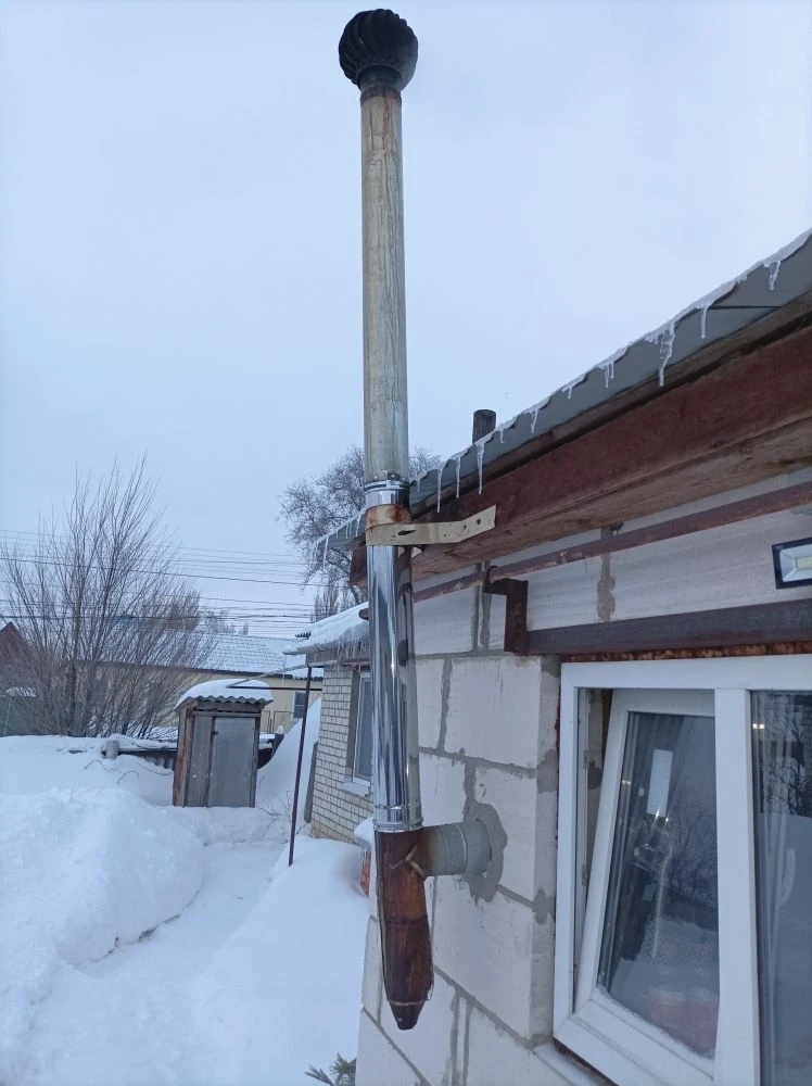 Тогда муж не стал замарачиваться со сварной стальной конструкцией, да и металл подорожал в разы, и вывел лёгкую трубу с другой стороны, подальше от конька. Много лет она там была встановлена и такого никогда не было. Хотя, и снега такого тоже давно уже не было). Прошлая снежная зима когда была, была ещё старая крепкая труба).