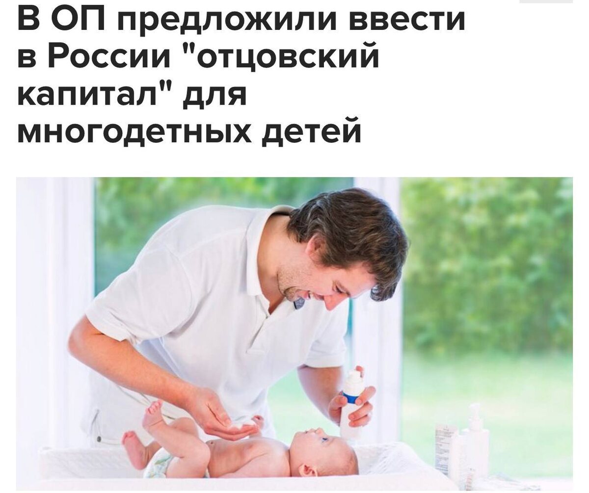 С инициативой ввести «отцовский капитал» выступили в Общественной палате Председатель комиссии Общественной палаты РФ по демографии Сергей Рыбальченко уверен, что это замотивирует мужчин заводить больше детей По его словам, зачастую в многодетных семьях финансовая ответственность возлагается на мужчин, так как около 40% многодетных матерей уже не выходят на работу. При этом, согласно опросам репродуктивных планов семей, у мужчин желаемое число детей выше, чем у женщин