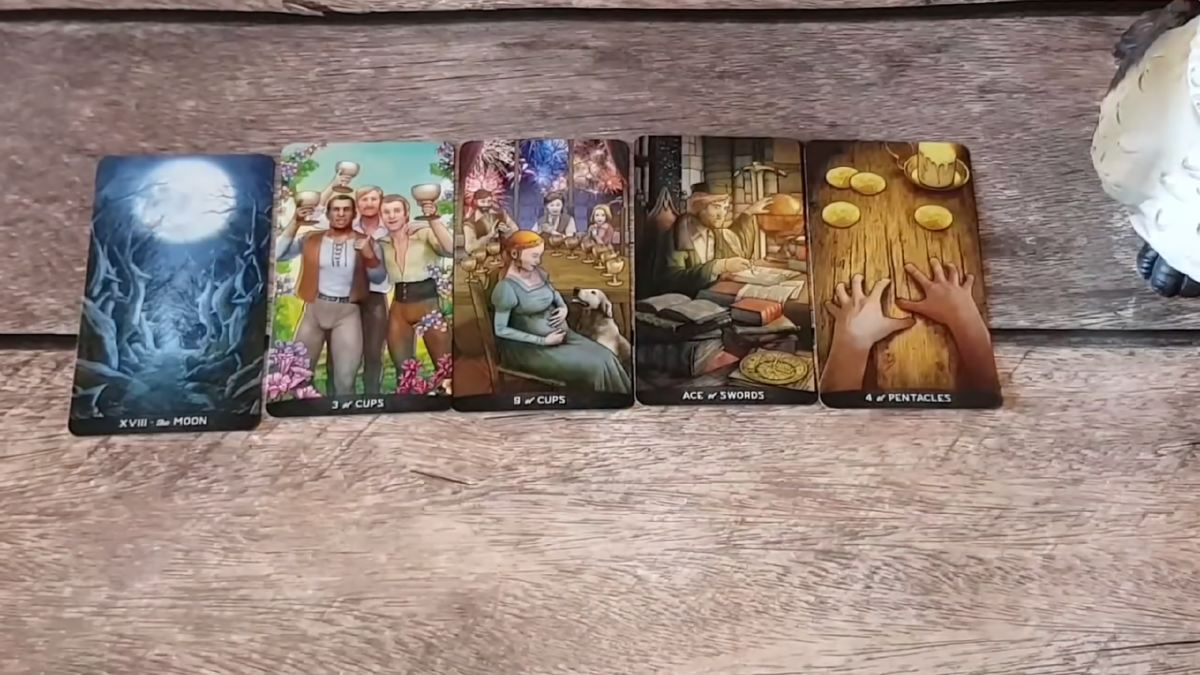 Что ещё скажут карты? Только Кубки. Суббота, вся зависимая. Девчонки, посмотрите: едва мужчина просыпается в выходной, как друзья уже зовут его: «Эгей, Витек, мы тебя ждём! Давай в гараж, давай на футбол, давай выпьем!». Это любитель шумных компаний, человек, который обожает поездки и никогда не откажется от лишней рюмки. Он мастерски уходит от обязанностей, предпочитая весело провести время с друзьями, за рыбалкой или за бутылкой. Извините за грубость, но он вполне может врать, что находится на работе, охраняет важного начальника в засаде, а сам в это время бухает в гараже до поздней ночи. Мне так кажется. Девятка Кубков. Почему здесь образ беременной женщины? Возможно, у него сейчас беременная жена. Но скорее всего, это символ человека, который обожает комфорт и спокойствие. У него полно идей, он с ними носится, но разродиться ими — вопрос другой. Я вижу его именно так. Девятка Кубков — это безмятежность, салют на радость. Пока перед нами праздный человечек, который любит планировать, но потом всё это рассасывается, и планы остаются лишь планами. Четвёрка Мечей. С чем он связан? Скорее всего, с бумагами, с какими-то талмудами. В принципе, он не глуп. Посмотрите, здесь он сидит, будто с учёной степенью. Не факт, конечно, но во всяком случае, нельзя сказать, что он глупец. В сочетании с Луной я бы назвала его хитроумным. Не хитрожопым, а именно хитроумным — умеет так запудрить мозги, что мало не покажется. Из плюсов — у него есть интеллект, он либо много читает, либо читал раньше. Это видно и приветствуется. Но вот смотрите: Четвёрка Пентаклей. Жадноватый человечек. Насколько он любит веселье, настолько же любит считать копейки. Судя по этой карте, он часто развлекается за чужой счёт. Есть в нём и крохоборство: «Комфорт мне нравится, жизнь должна быть райской, но желательно, чтобы кто-нибудь другой всё это устроил». Вот такой он — мечтает о роскоши, но не хочет за неё платить.