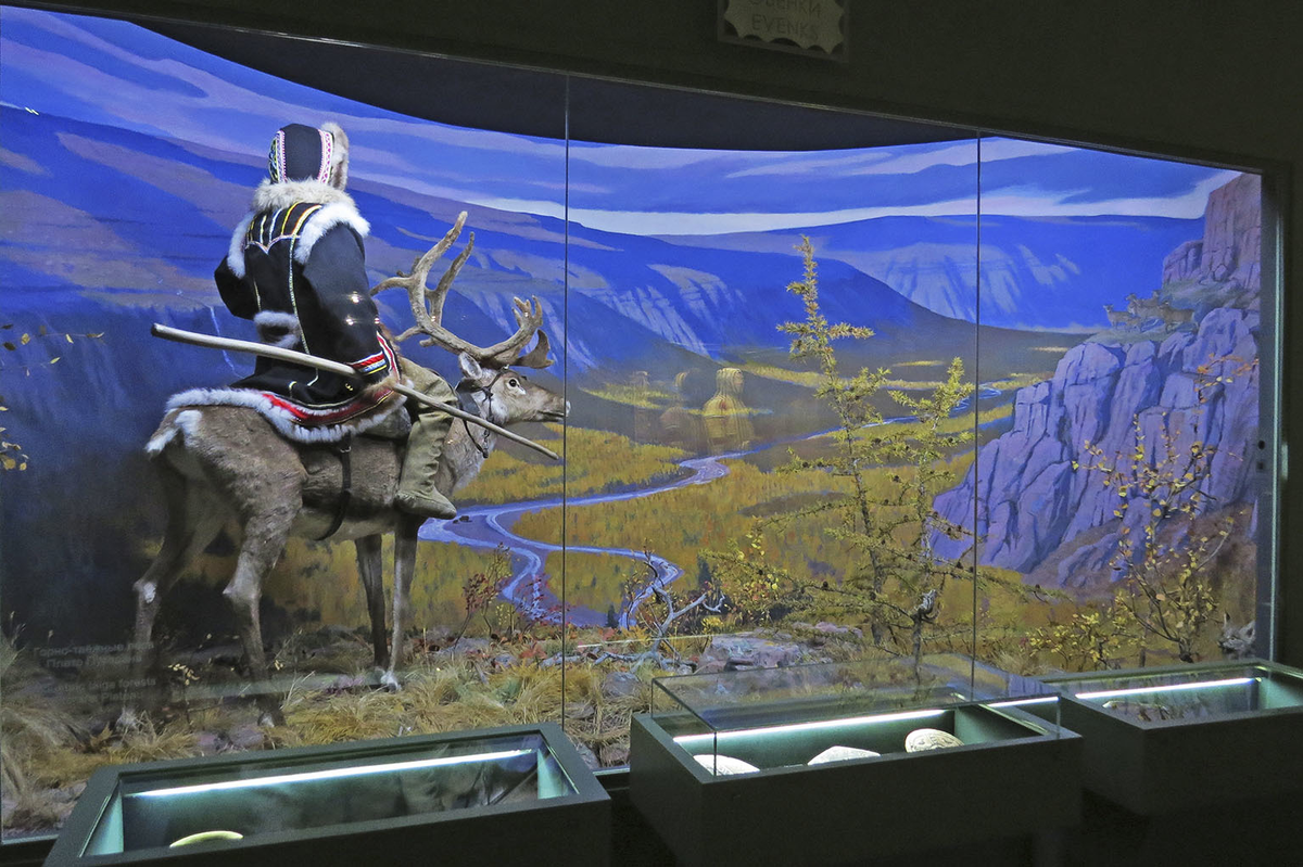 Самый неочевидный из коренных народов Таймыра - эвенки, о которых я прежде рассказывал на БАМе и в Якутии, в Эвенкии и в далёкой Маньчжурии. Но дело в том, что, выжитые около 1500 лет назад из уютных степей Прибайкалья, тунгусы (так их называли до 1920-х годов) расселились по земле величиной в Австралию, на севере упираясь в обрывы плато Путорана. В 1960-х они заместили волжских немцев, латышей и литовцев, не по своей воле построивших в 1952-59 годах посёлок Хантайское Озеро (230 жителей) в одной из долин. Теперь это единственный преимущественно эвенкийский (хотя в нём и другие народы есть) посёлок Таймыра, а всего в районе живёт 260 эвенков, меньше 1% от огромного среди малых (36 тыс. человек в России и столько же в Китае) народа. В дю (чуме) всё выглядит знакомым: кумаланы (круглые ковры из шкур) и эмкэ (берестяные люльки с деревянным каркасом, столь удобные, что в ходу до сих пор!), причудливое бисероплетение: Зазубренный унтувун (бубен) шамана (напомню, что это слово в мир пришло