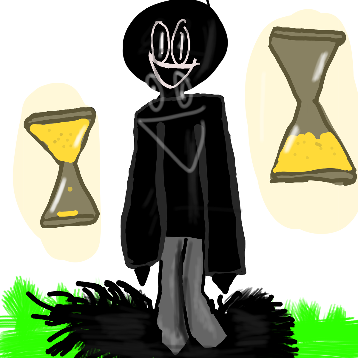 1. Одет во всё чёрное, часто ходит с обманчивой улыбкой.Вокруг него летают часы , но зачем?..