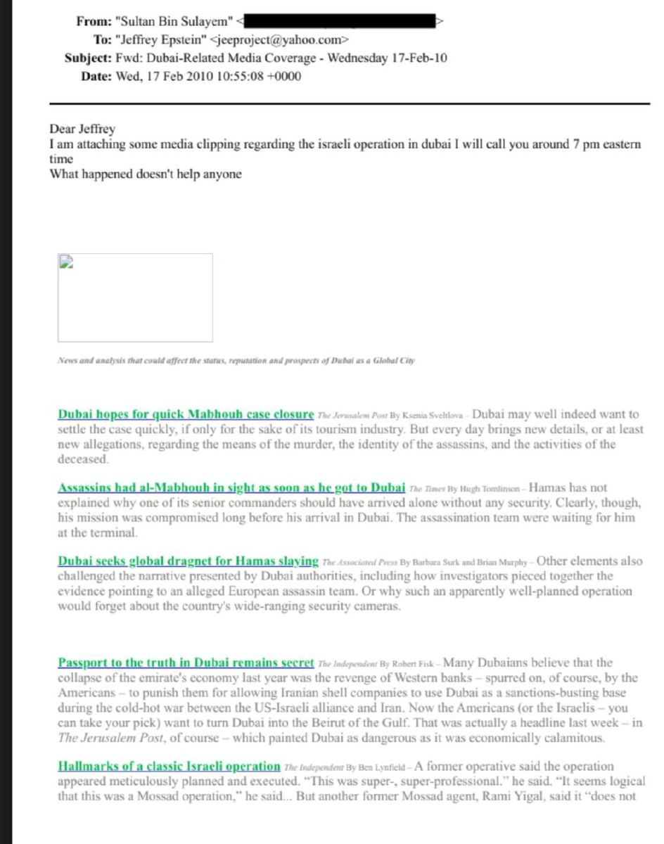 Султан Бин Сулайем пишет что позвонит Эпштейну и говорит что то, что произошло (как я понимаю ликвидация кого-то Моссадом в аэропорту Дубая