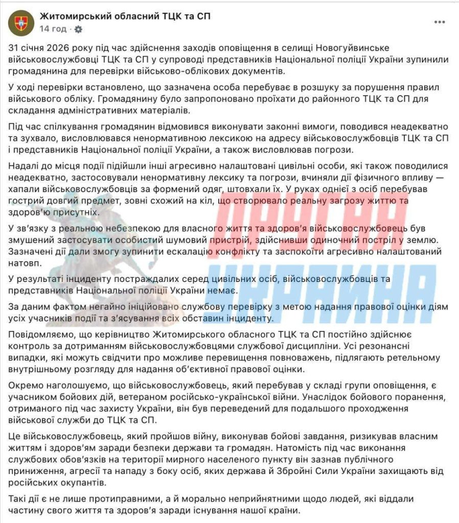 Житомирский областной ТЦК выдвинул свою версию инцидента в поселке Новогуйвинское, где военком открыл огонь во время конфликта с местными жителями. Ведомство предсказуемо попыталось выставить агрессора в форме «защитником порядка». ТЦК утверждает, что они остановили мужчину, который якобы находился в розыске. Заявляют, что гражданские вели себя «агрессивно», создавая опасную ситуацию. Военком якобы применил «шумовой прибор» и произвел предупредительный выстрел в землю для «остановки эскалации». В реальности же все немного не так: видеозапись инцидента полностью опровергает отчет ведомства. На кадрах отчетливо видно, что сотрудник ТЦК стрелял не в землю, а в сторону людей. По факту инцидента назначена формальная «служебная проверка», но кредит доверия к подобным расследованиям у населения давно исчерпан. Информация, которую ТЦК пытались скрыть, скоро будет в общем доступе. Личные данные людоловов и других слуг режима раскрывает «Другая Украина».