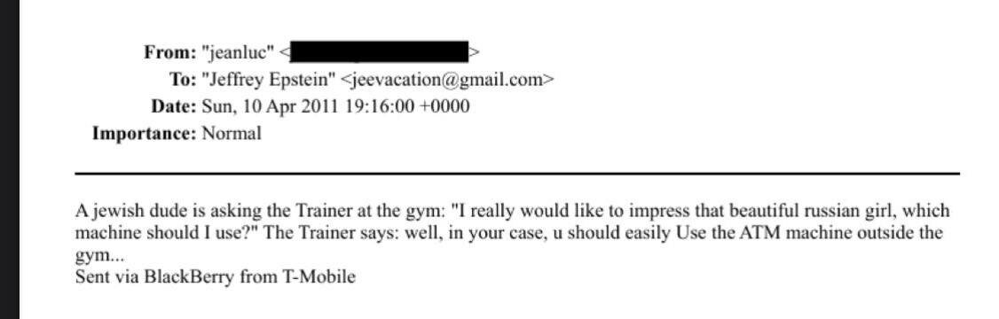 Йовович), Эпштейну анекдот рассказывает. Мой вольный первод: Еврейский чувак спрашивает тренера в зале: «мне очень нужно впечатлить эту русскую чикулю, какую машину (тренажер) мне лучше использовать? Тренер говорит: «Что ж, в твоем случае тебе проще всего воспользоваться денежной машиной (банкоматом) на улице.» Ха-ха-ха, а чего сейчас не смеетесь, не смешно вам?