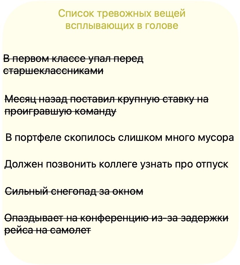Про себя или вслух несколько раз. Разделения зоны контроля. 1) Письменно составить список всех беспокоящих на данный момент ситуаций и вычеркнуть всё, что невозможно проконтролировать или исправить. 2) Всё