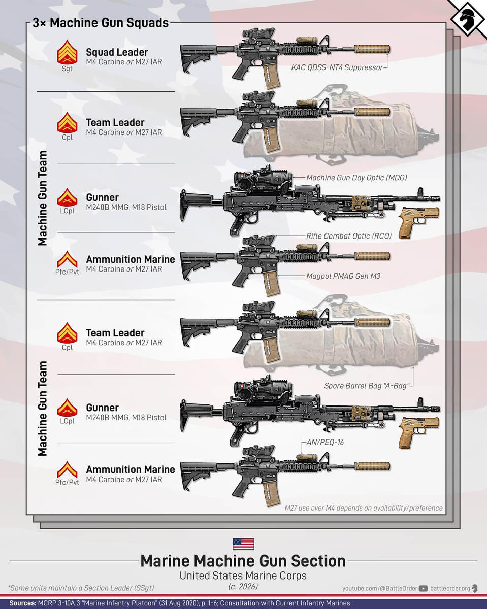 В отличие от армии США, которая поддерживает отделение тяжелого вооружения на уровне стрелковых взводов, Корпус Морской Пехоты всегда придерживался своей концепции централизованного подчинения взводов тяжелого оружия на уровне стрелковых рот. В составе таких взводов пулемётная секция, состоящая из трёх отделений по 2 пулемётных расчёта в каждом, или 6 расчётов М240 на стрелковую роту. Соответственно, штат пулемётной секции сформирован таким образом, чтобы каждому стрелковому взводу роты могло быть придано пулемётное отделение из двух расчётов. Таким образом, количество пулемётов придаваемых стрелковому взводу морской пехоты соответствует армейской лёгкой пехоте, но они передаются командованием роты под задачу, а не находятся у взвода как его штатная часть. Централизация систем вооружения, вместо их распределения, в первую очередь решает проблему подготовки личного состава. Специальные знания и методики подготовки собраны в одном месте, где применение конкретного вида вооружения являет