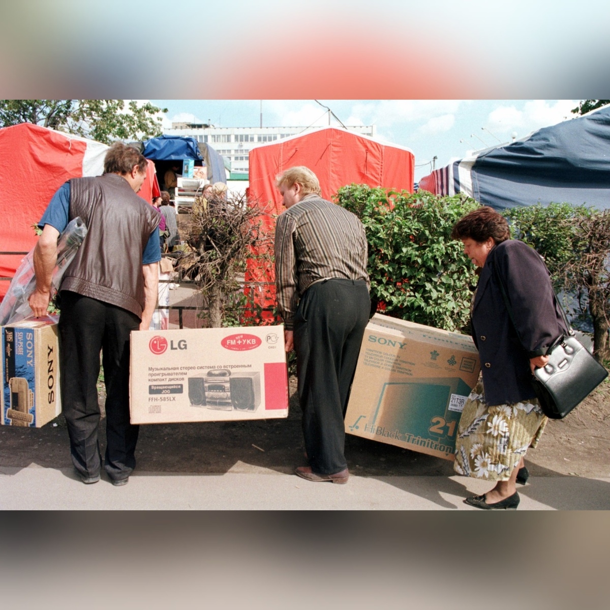 На первой фотографии мы видим людей, которые стихийно скупают технику после «Чёрного вторника» 1998 года. Это событие стало одним из самых значительных экономических кризисов в России, и в результате люди стремились запастись электроникой и бытовой техникой, пока это было возможно. Место действия — Горбушка, известный рынок в Москве, который в те годы стал центром торговли электроникой.