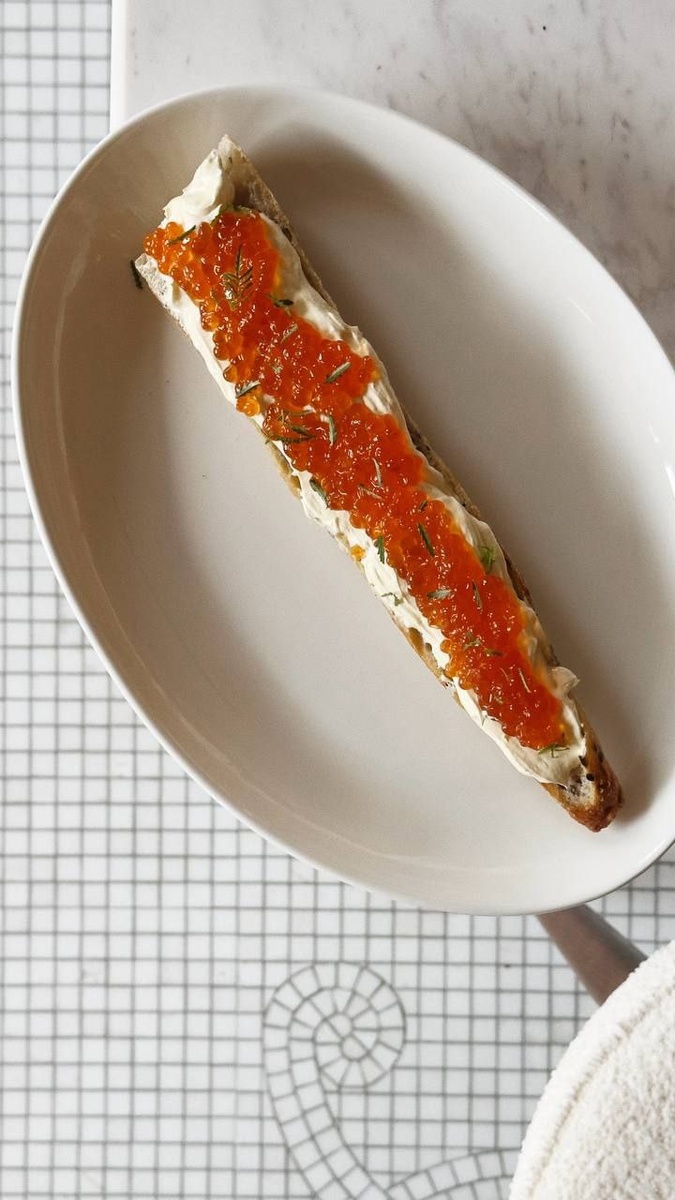 Полбагета с красной икрой и драники с неочевидной (капустной) основной, гуакамоле, яйцом-пашот, лососем, миксом салата и щедрой порцией сыра