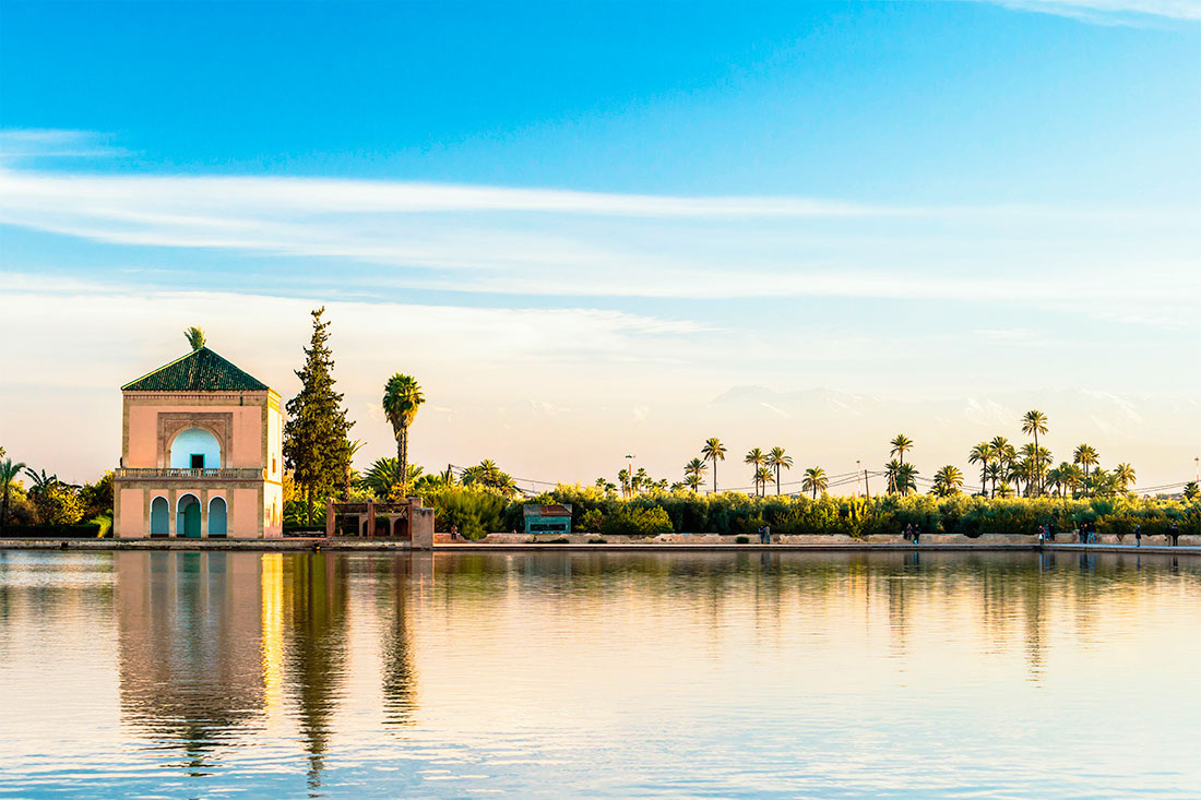 Сады Менара — обширная оливковая роща, давно ставшая излюбленным местом для прогулок у местных жителей и туристов. В центре садов находится большой искусственный бассейн-резервуар, построенный ещё в XII веке для орошения плантаций. Рядом с ним стоит небольшой павильон с пирамидальной зелёной крышей — узнаваемый памятник архитектуры, знакомый по многим открыткам. Вид на павильон и бассейн на фоне заснеженных вершин Атласских гор — одна из самых фотогеничных панорам Марракеша. В отличие от шумного центра, в садах Менара царит атмосфера спокойствия и умиротворения, идеально подходящая для отдыха и наслаждения природой.