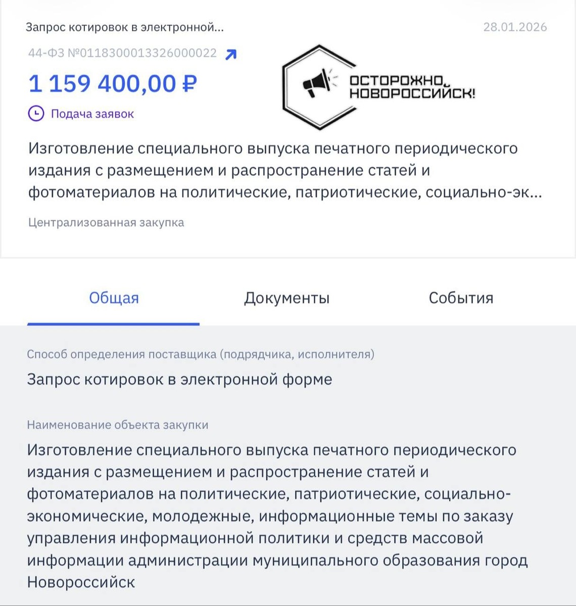 ? В Новороссийске утверждён ещё один муниципальный контракт на информационное сопровождение деятельности администрации. Его стоимость — 1,1 миллиона рублей. Исполнителем, как и в предыдущих аналогичных закупках, стало издание «Новороссийский рабочий». Контракт предусматривает подготовку и размещение материалов, формирующих положительный информационный фон о работе органов власти и главы города. Речь идёт о публикациях в печатных СМИ с заранее определённой тематикой и обязательным согласованием содержания с заказчиком. Ранее в этом же году администрация уже заключила контракт на 6,5 миллиона рублей на аналогичные цели освещение политической, социально-экономической, патриотической и молодёжной повестки. Новый договор фактически дополняет уже существующую систему бюджетного медиасопровождения. Суммарно только за последние контракты на формирование нужного информационного поля из бюджета города направляется более 7,5 миллиона рублей. Эти средства расходуются на публикации, которые дол