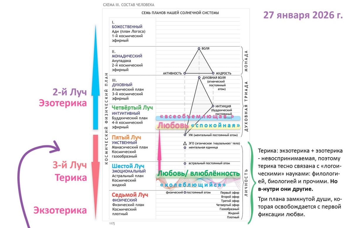 В основном она базируется на 4, 3, 2 и 1-м Лучах. Что касается 7, 6 и 5-го Лучей – эти энергии связаны с силовыми потоками (Третьего Луча). Поэтому они считаются замкнутыми («анима мунди» – замкнутая душа или замкнутый эфир). Он находится в физическом и ментальном телах. Что касается Шестого Луча, он имеет колебательное состояние. Чем он ниже по значению, тем выше колебания. Он достигает полного спокойствия на буддхическом плане, когда буддхический эфир освобождается (буддхический подплан на астральном плане) и создаёт в человеке, в его эмоциональном теле, уже фиксируемое состояние любви, влюблённости. Из него можно перейти на буддхический план (астральный подплан), и поднимаясь дальше, войти в единое состояние Любви. Это состояние не связано с силовыми потоками, оно расширяется и превращается во всеобъемлющую космическую Любовь. А всё начинается с обычного буддхического подплана астрального плана, с первой фиксации человеческой влюблённости. Читать далее.