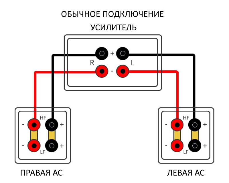 На колонках сдвоенные клеммы обычно соединены металлическими перемычками. При переходе на bi-wiring их снимают. В результате сигнал от усилителя делится по проводам: один идёт на твитер, второй — на басовый динамик.