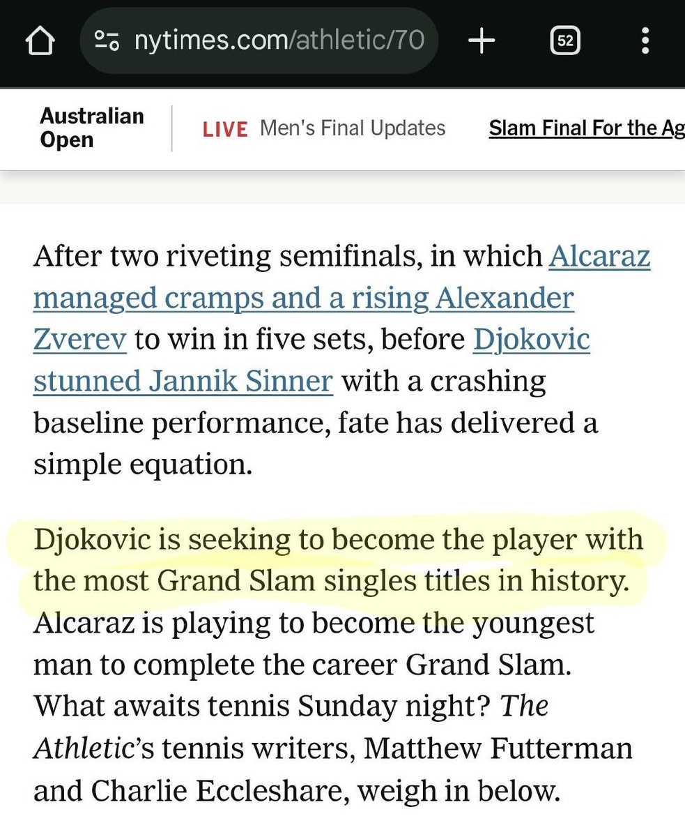 В финале Australian Open Джокович стремится стать игроком с наибольшим количеством титулов Grand Slam в истории. Алькарас играет, чтобы стать самым молодым человеком, когда-либо выигрывавшим карьерный Grand Slam.