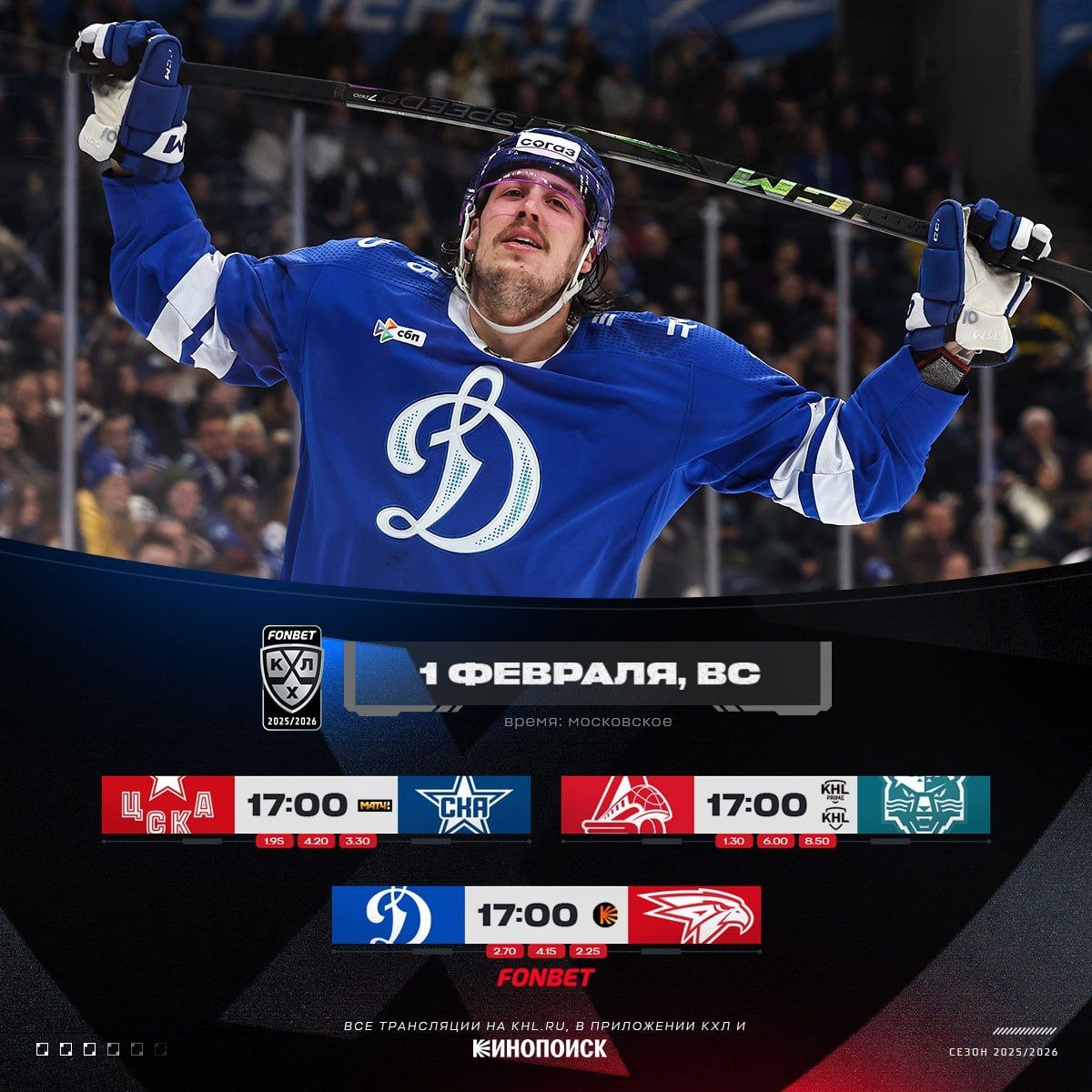 : На первый взгляд все три встречи с явными фаворитами, но всё же сюрпризы могут быть. ⭐⭐3:1 СКА в глубоком кризисе. Команда Игоря Ларионова потерпела уже 6 поражений подряд, а в последних 4 матчах забросила всего две шайбы. Московские же армейцы на данном отрезке чемпионата гораздо мощнее и успешнее - 3 победы подряд. Но с другой стороны это же дерби, принципиальное противостояние, что вносит элемент непредсказуемости. Да и может Леонид Тамбиев привнесёт в игру петербуржцев что-то новое. 🚂🐆4:1 Локомотив сейчас на ходу - 4 победы кряду. Казалось бы, без шансов для Сочи. Но в то же время такие локальные успехи порой расслабляют, а Леопарды в нынешнем чемпионате не редко за подобное наказывали. 🔵🦅2:1 У Авангарда шесть побед подряд, у Динамо лишь три победы за последние 13 матчей. Но глобально в действиях бело-голубых нет хаоса и анархии. Просто они не пользуются создаваемыми возможностями и проваливают отдельно взятые отрезки (часто концовки). А если сегодня прорвет? Тогда есть в