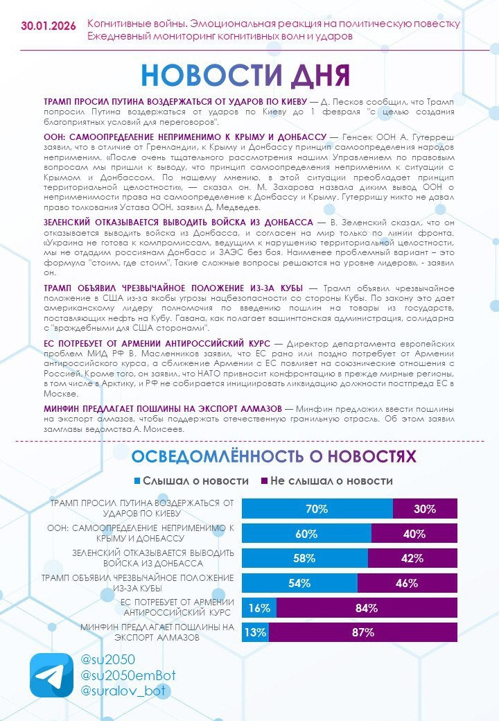 30.01.2026 🔹 Большинство опрошенных (65%) находятся в спокойном состоянии. Усталость отметили 19%, бодрость — 8%, а нервозность остается на минимальном уровне (4%). 🔹 Осведомленность о новостях на среднем уровне. Наиболее известной оказалась новость о том, что Трамп просил Путина воздержаться от ударов по Киеву до 1 февраля (70% слышали), наименее известной — о том, что Минфин для поддержки отечественной гранильной отрасли предложил ввести пошлины на экспорт алмазов (только 13% были осведомлены). 🔹 Самый позитивный отклик вызвала наименее известная читателям новость о предложении Минфина ввести пошлины на экспорт алмазов: 33% позитивных реакций, в том числе одобрение (23%) и интерес (7%). Среди респондентов, которые отнеслись к сообщению нейтрально (всего 65%), преобладает вариант «недостаток информации», указывающий на слабое продвижение инфоповода. 🔹 Самый негативный отклик вызвала новость о том, что Трамп объявил чрезвычайное положение в США из-за якобы угрозы нацбезопасност