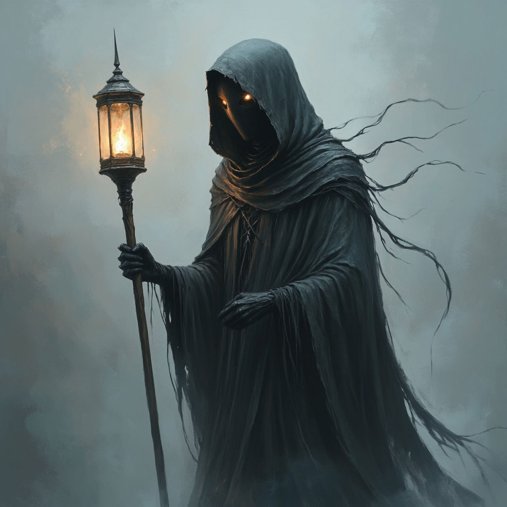 Он не был монстром. Это было высокое, тонкое существо, сотканное из теней и тумана, с длинными, паучьими пальцами. В одной руке он держал посох, увенчанный фонарём, в котором метались не огни, а крошечные, яркие искорки — украденные души, эссенция жизни. Его лица не было видно, лишь два холодных огонька горели в глубине капюшона.