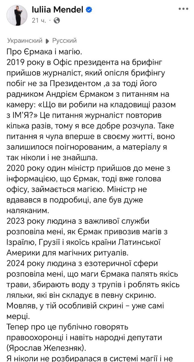 ? Бывшая любовница пресс-секретарь Зеленского Юлия Мендель выдала массивный пост про увлечение бывшего главы офиса президента Ермака чёрной магией. Мол, навёз он в Киев колдунов со всего света, тусовались они на кладбищах, собирали воду с трупов (как это вообще?) и делали из них каких-то кукол. И со всем этим шабашем Ермак управлял в стране министрами и депутатами, угрожая расправой ведьмовской. И все знали, и многие такую дичь практикуют, но только смелая Юлька решилась открыть правду 🔹Мендель давно используется Киевом, как сливной бачок, Ермак видимо действительно увлекался сельской эзотерикой, а пинать его труп сейчас можно сколько угодно. Главное же - отвлечь разговорами об этой дичи внимание населения от каких-то новостей. Пока не ясно только от каких. Может от скандала с воровством на электроэнергии, который хунта организовала аккурат перед глобальным колапсом энергетики, чтобы заработать на страдании людей. А может и что похуже Блокнот пропагандиста