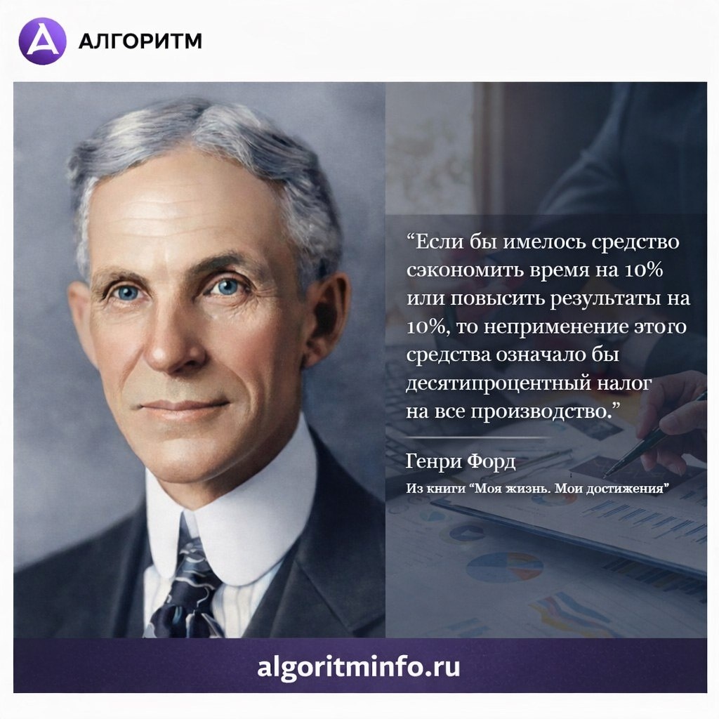 “Если бы имелось средство сэкономить время на 10% или повысить результаты на 10%, то неприменение этого средства означало бы десятипроцентный налог на все производство.”