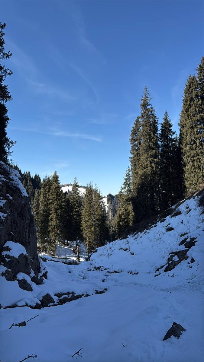 )) В кошшшках!😂 Это такие насадки на обувь с шипами. Чтобы удобнее было ходить по льду и снегу. Не прям вот альпинистские. Но тоже такие. Типа ледоступов их ещё называют. Маршрут относительно лёгкий. Туда-обратно часа три получилось. Но кайфа — на весь день) Что мне ещё очень нравится в горах — все здороваются друг с другом. Кто-то желает хорошего дня. Кто-то легкого подъема) И тепло, кстати, было. Наверное даже немножечко плюс. Может 2-3. Но вы бы знали какая у нас история с этими кошками былааааа. Мы, короче, вчера ходили на квиз. И только вечером вспомнили, что нужны кошки. Если в горы пойдём. Поехали за ними в магазин — там цена одной пары около 4х т.р. Нам надо две пары. На маркетплейсе — 1т.р. А мы фиг знает будем в этих кошках ходить. Часто ли. И т.д. Я смотрю на маркетплейсе доставку «сегодня» — нет 😵💫 Уже думаем купить в магазине. И в последний момент приходит идея глянуть объявления. Типа Авито местного. А там!.. Прокат 😍 500р/сутки. Короче, мы срочно за этими