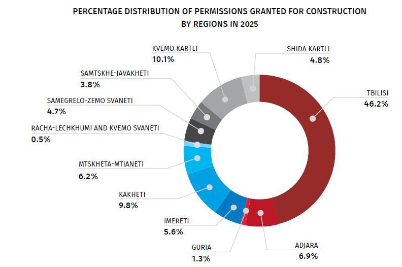 Более 70% всех одобрений получены в четырёх регионах страны. На Тбилиси пришлось 46,2% общего объёма. Существенные доли также зафиксированы в Квемо-Картли (10,1%), Кахетии (9,8%) и Аджарии (6,9%). Таким образом, основная часть новых проектов по-прежнему концентрируется в столице и экономически наиболее активных территориях.