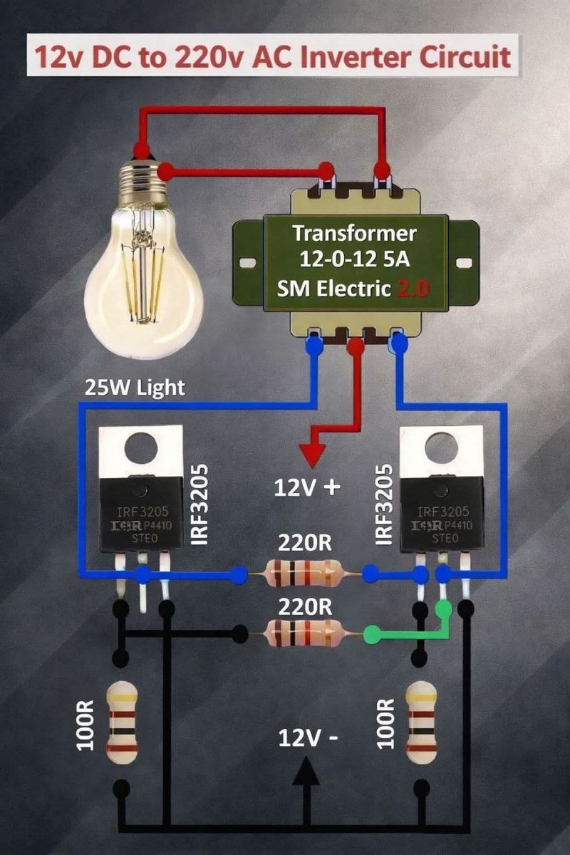 На рисунке представлена схема самодельного инвертора напряжения, который способен питать обычную лампочку на 220 В от стандартного аккумулятора на 12 В. Компоненты схемы: - Трансформатор: В этой схеме используется понижающий трансформатор, который в данном контексте выполняет функцию повышающего. Его характеристики: 12-0-12V, 5A. - Транзисторы: В схеме задействованы два мощных полевых транзистора IRF3205, которые играют роль ключей. - Резисторы: В схеме предусмотрено два резистора сопротивлением 220 Ом (маркировка 220R) и два резистора по 100 Ом (маркировка 100R). - Нагрузка: В качестве нагрузки используется светодиодная или филаментная лампа мощностью 25 Вт. Как это работает: Схема представляет собой упрощенный пушпульный (двухтактный) автогенератор. Транзисторы работают в поочередном режиме, создавая переменный ток в первичной обмотке трансформатора, который затем повышается до 220 вольт на выходе. Важные примечания: - Охлаждение: В процессе работы транзисторы IRF3205 могут сильно