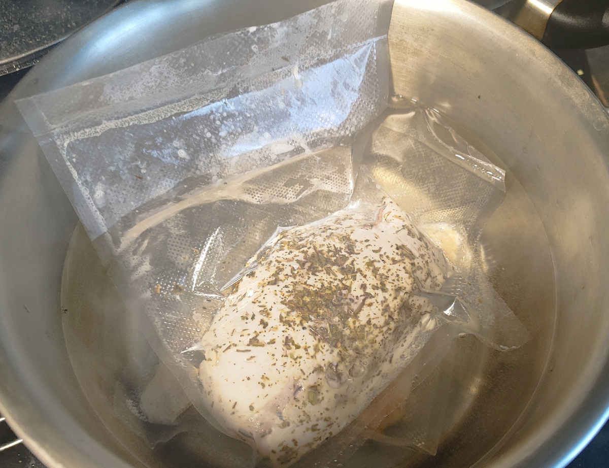 Курица в запаянных пакетах два с лишним часа в горячей воде чилила. Я термометром время от времени температуру проверяла - нормально все. В собственном соку протомилась, специями напиталась - ммм!