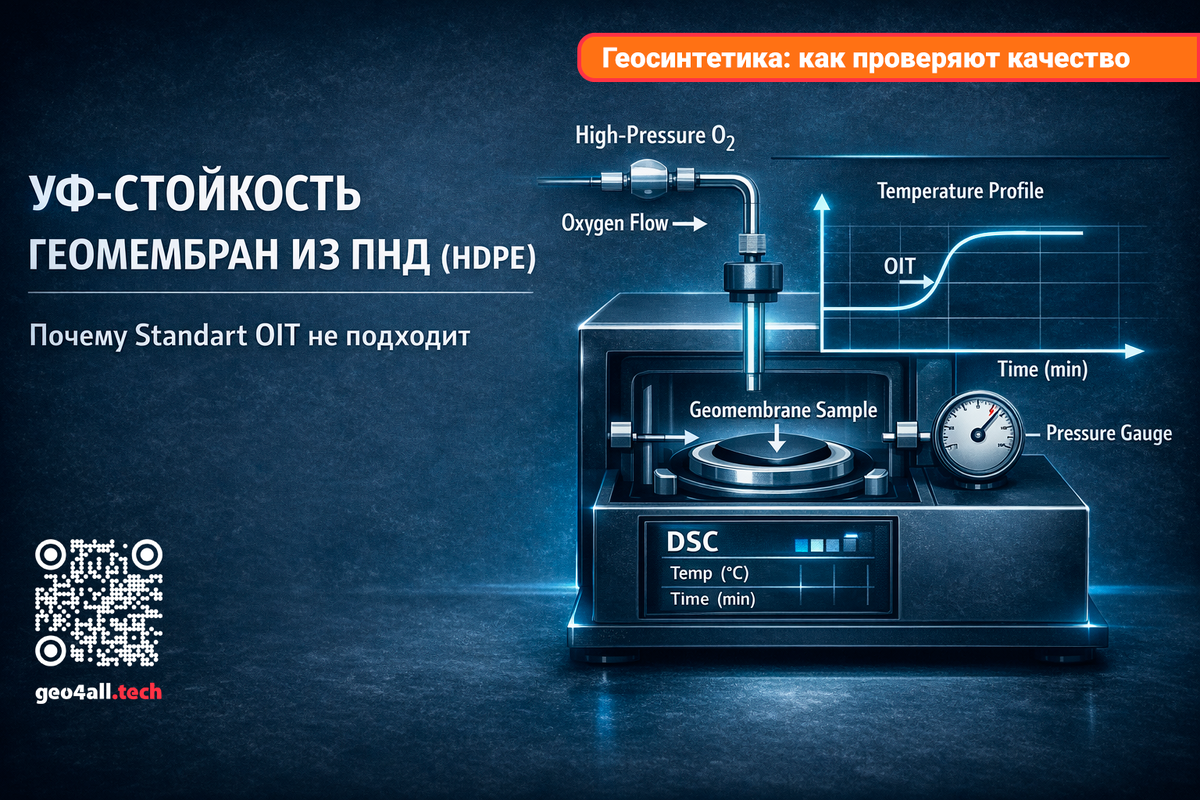 Спецификации GRI GM13 (HDPE Geomembranes) и GRI GM42 (HP-HDPE Geomembranes for Extreme Environments) прямо закладывают использование HP-OIT (ASTM D5885) для оценки сохранения антиоксидантного ресурса после старения. В них нормируется процент сохранённого HP-OIT после испытаний, включая УФ-старение по ASTM D7238. Применение Standard OIT для этих целей считается некорректным, поскольку не соответствует экспериментальной базе, на которой основаны спецификации.