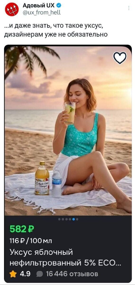 Не удивлюсь, если карточка с таким уксусом продаёт лучше. ИИ нарисовал — селлер заработал. Что там внутри, уже не так важно.