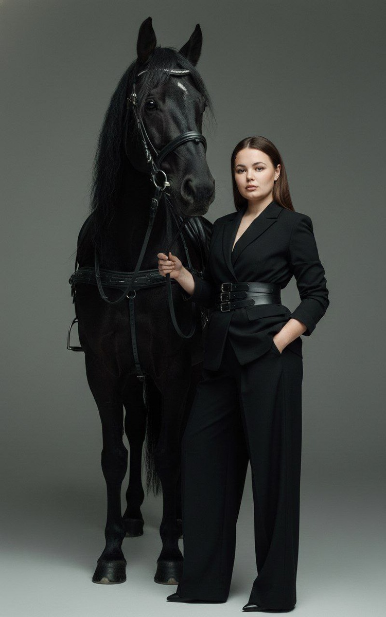 😀Выбираем "нейросети" 😀Нажимаем "Nano Banana" 😀Нажимаем "Nano Banana Pro" 😀Прикрепляем через скрепку свое фото и выбранный промпт 😀Наслаждаемся результатом🫶 Создай фото не меняя черты лица и цвет волос. Макияж-нюд.Высококлассный студийный портрет в полный рост: элегантная фигура в монохромном черном костюме (пиджак, широкие плиссированные брюки, многослойный кожаный пояс), стоит вплотную к крупной черной лошади с блестящей шерстью и длинной гривой, упряжь из черной кожи. Композиция вертикальная, полный рост, модель слегка повернута в три четверти, рука в кармане — уверенная спокойная поза. Свет — мягкий боковой ключевой свет слева + едва заметная контровая подсветка для отделения от фона, нейтральный матовый серый фон, минимальные тени, кинематографичная тональность. Детализация — четкие текстуры шерсти и ткани, мягкая, но выразительная ретушь, легкая десатурация с холодным серо-зеленым оттенком, матовое финиширование, глубокие контрасты. Стиль — модный редакционный, минимализм,