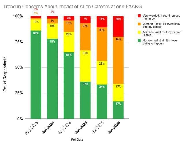 An anonymous Reddit user claims to have polled colleagues at a major tech company about AI replacing their jobs every six months. The unverified post states some workers are unconcerned while others are terrified, according to the user's account.