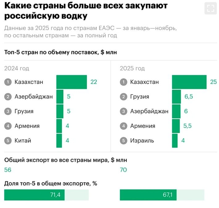 Казахстан уже второй год подряд держит лидерство в списке стран, которые больше всего закупают алкоголь в РФ. Статистика появилась на сайте РБК. Согласно данным, Казахстан за 2025 год нарастил поставки с 22 млн долларов до 25 млн. долларов. На втором месте оказалась Грузия, после Азербайджан, Армения. И замыкает ТОП-5 Китай, второй год стабильно закупая российскую водку на 4 млн. долларов. Фото: РБК Присылайте фото, видео и информацию анонимно — в наш бот t.me/CentralMedia24_KZbot или на WhatsApp +77080323818 😎Следите за новостями тут: https://dzen.ru/id/67fc8dffe608bc669477821e