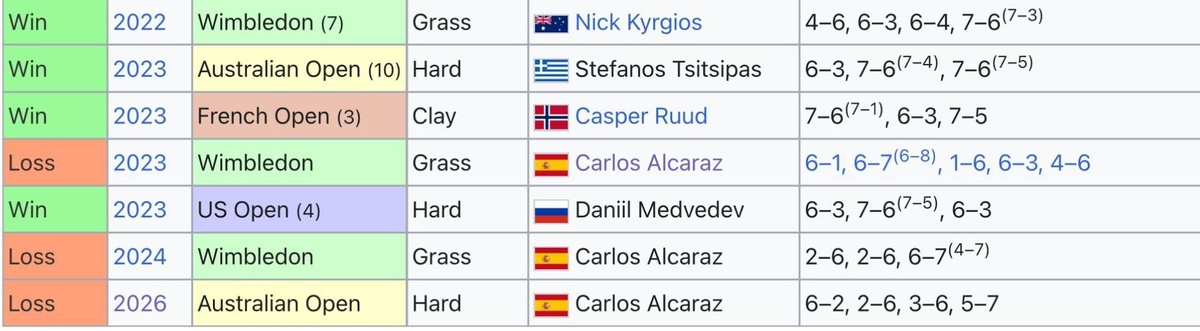 😂 На картинке результаты финалов турниров Большого шлема, в которых Джокович победил, но Алькарас доставил ему проблем. Надпись на картинке: Примечание: Джокович победил Алькараса в четвертьфинале AO 2025 ценой своих ног 🦵 Подпишись на Эйс и точка
