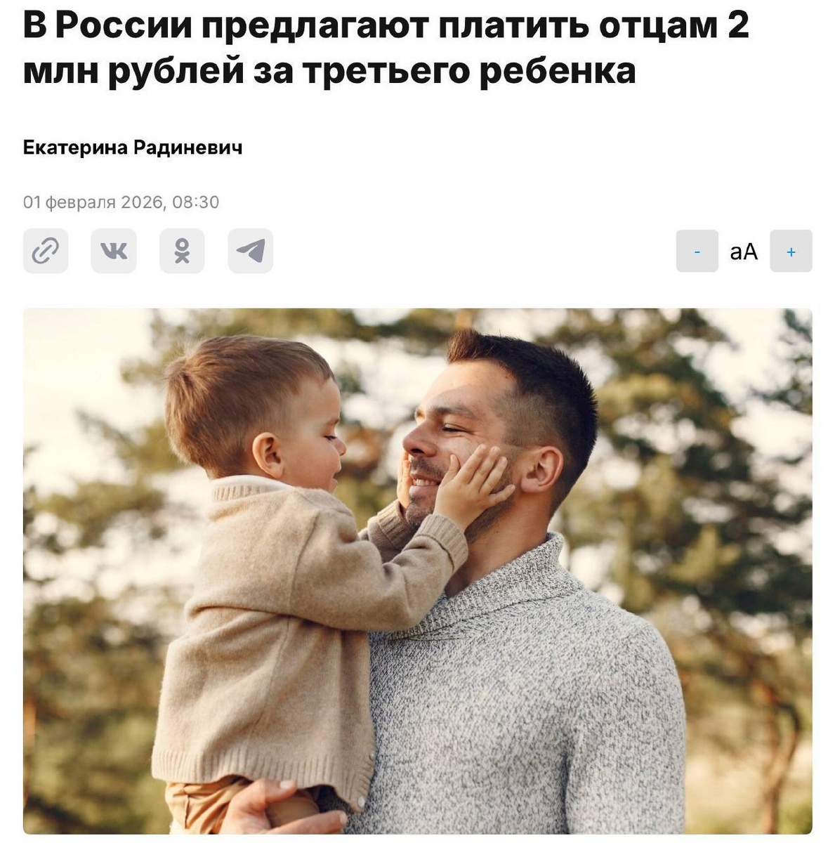 В Общественной палате РФ выступили с инициативой ввести специальную выплату для отцов в размере 2 млн рублей при рождении третьего ребенка. Авторы идеи уверены, что такая мера не только повысит ответственность мужчин, но и станет решающим стимулом для расширения семьи, так как именно на отцов ложится основная финансовая нагрузка в многодетных домохозяйствах. Предполагается, что «отцовский капитал» станет дополнением к уже существующему материнскому капиталу, а не его заменой.