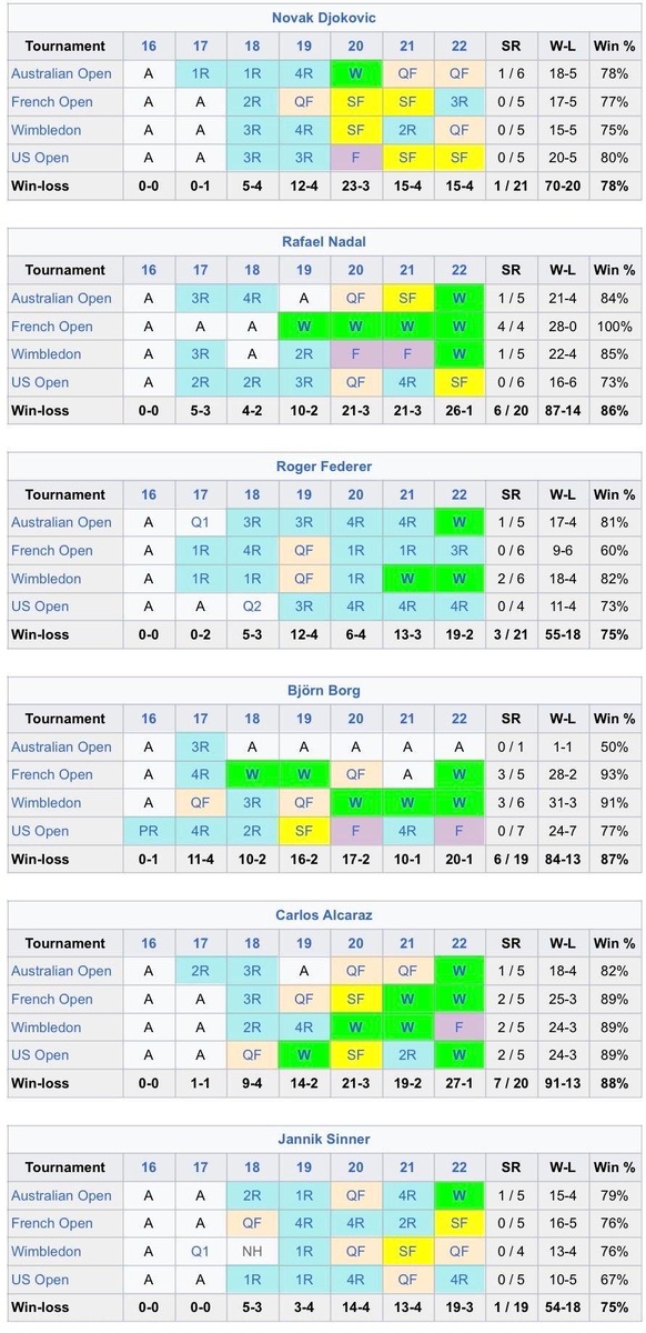 : Карлос Алькарас Australian Open: A French Open: QF Wimbledon: 4R US Open: Е Сравнение с другими легендами тенниса: Рафаэль Надаль, Роджер Федерер, Новак Джокович и Бьорн Борг. Подпишись на Эйс и точка
