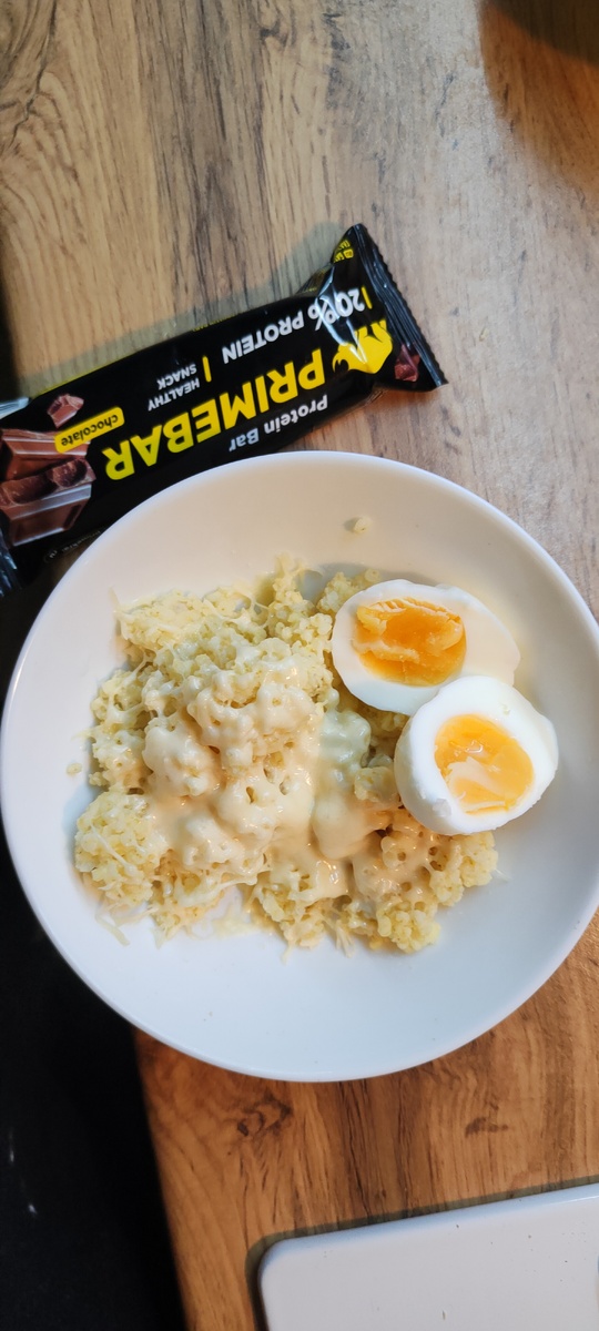Завтрак каша пшенная с сыром и яйцом, батончик протеиновый