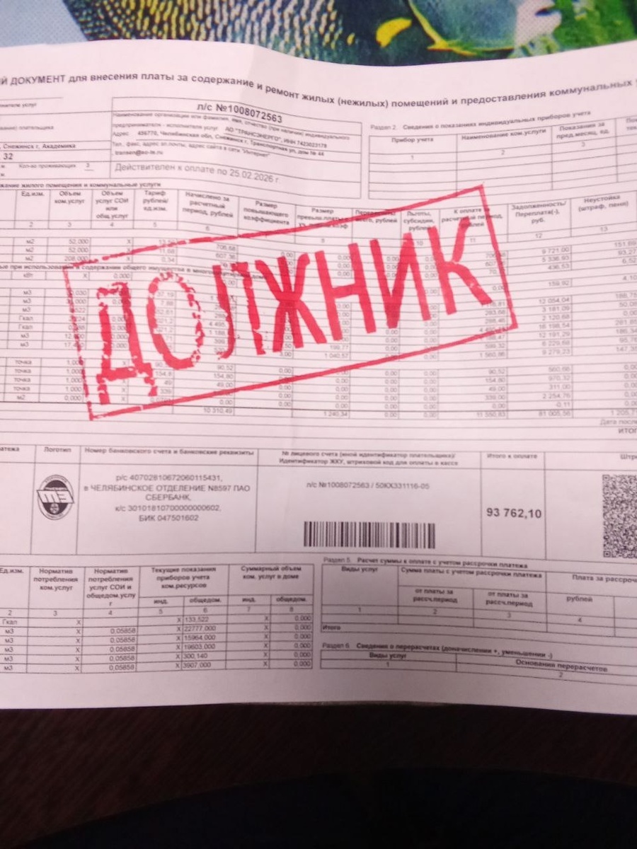 " . Сегодня вечером достал такую квитанцию из почтового ящика. Сумма в графе оплата 93000 руб . У меня НЕТ⚠️⚠️ ЗАДОЛЖНОСТИ по коммунальным услугам. Это НЕ ошибка я зашёл и проверил в личном кабинете совсем другая сумма лицевой расчетный счёт получателя там тоже совсем другой. 👉 Типичный Снежинск